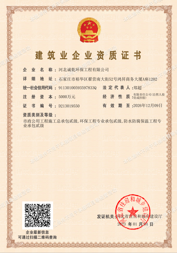 2023年1月4日,河北誠乾環(huán)保工程有限公司取得由河北省住房和城鄉(xiāng)建設(shè)廳頒發(fā)的市政公用工程施工總承包貳級資質(zhì)。