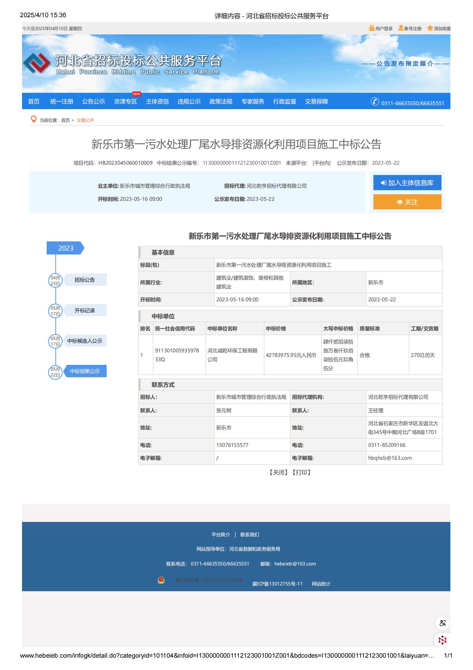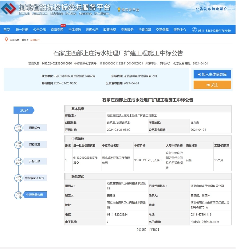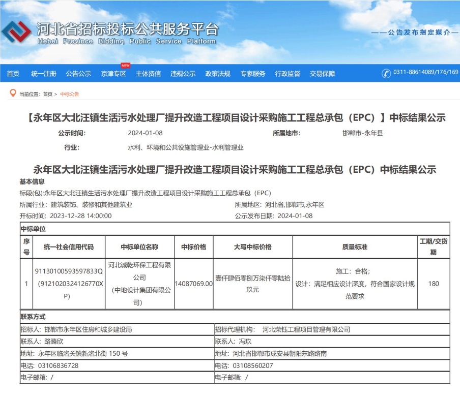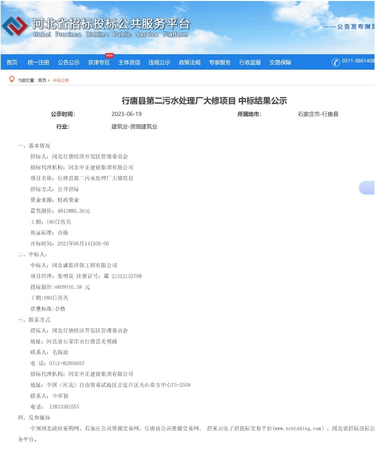 2023年6月,中標(biāo)行唐縣第二污水處理廠大修項(xiàng)目,中標(biāo)額4809910.58元,包括提升泵房及旋流沉砂池粗、細(xì)格柵、提升泵、配電柜維修更換,地面及門窗修復(fù);反硝...